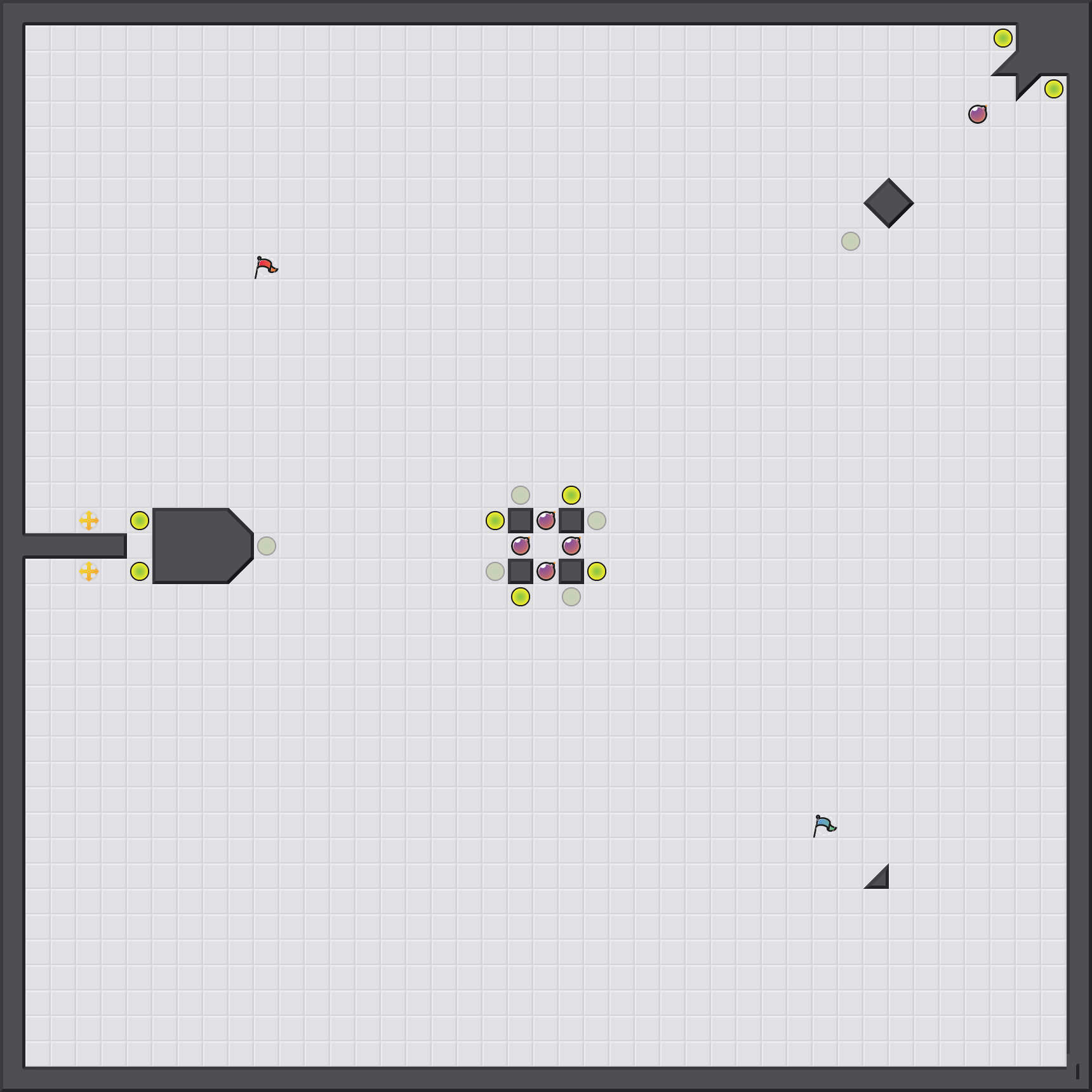 -- Original U-M ID: 37278 -- Just fiddling around with gravity wells, trying to find interesting map elements to make with them. I think the general concept of having the gravity well pull you toward portals + shielding the gravity well with walls or bombs is much more friendly to less skilled players. Just gotta make sure to either place the exit portal outside the gravity well (top right), inside the gravity well but far enough out that you can always walk out (left), or shield with bombs that you can hit if you get stuck against the wall (middle).