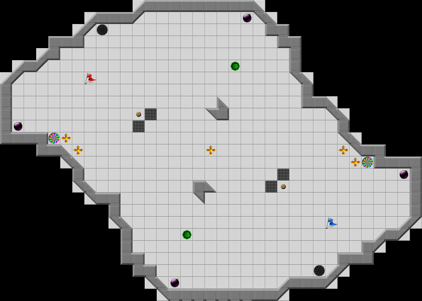Revisiting shake for possible edits due to recent downtrend in score: - Moved base bombs + wall setup in toward flag by 1 tile, reduced map width by 1 each side. more fixes for bad boost routes - Added some 45's around pup to open up more routes + moved pup over by a tile closer to 45 tile - moved the 45 & wall tiles below red flag/above blue flag up/down a tile to improve routes
