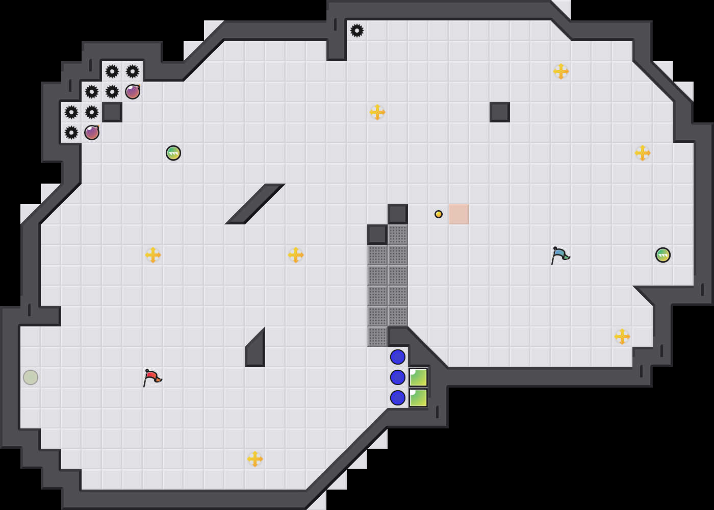 The only complaint was that the neutral portals were OP because red could just stand in front & camp that position. Now the portals are offensive team portals, and that scenario is no longer possible. Green gates to prevent camping behind the team portals, and behold: The first fun, balanced asymmetrical map. I knew I could do it.